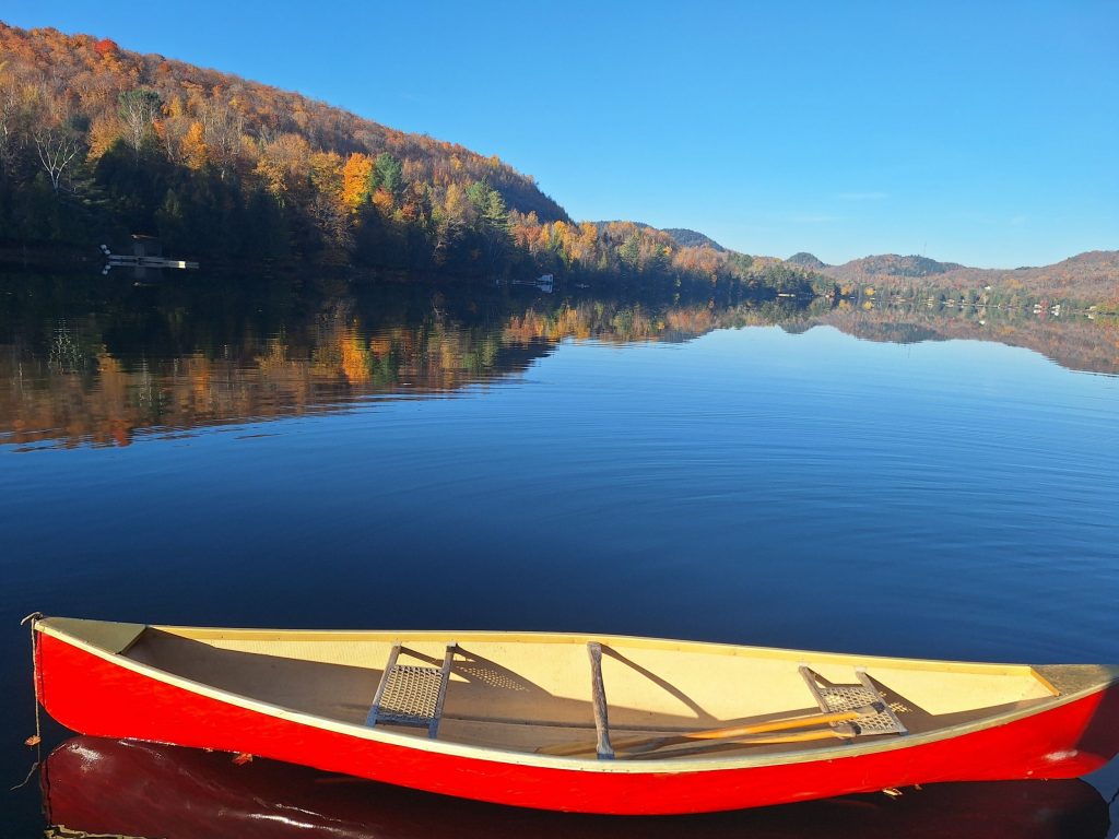 Aujourd’hui, Julien repart à Montréal pour le travail, tandis que Margaux reste encore un peu avec nous. Nous en profitons pour ralentir et savourer cette journée à notre rythme. On a tellement aimé l'expérience du canoë hier soir qu'on repart pour un tour ce matin. Et comme le soleil est au rendez-vous, on en profite pour se baigner dans le lac et prendre un bain de soleil sur le ponton. On n'aurait jamais imaginé qu'il fasse aussi chaud au Canada au mois d'octobre !
